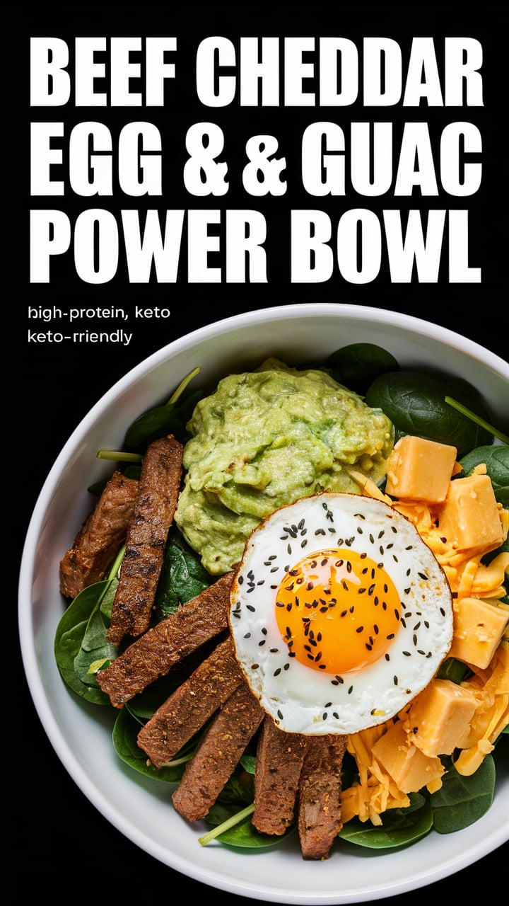 - Assemble Bowl: Layer base → beef → vegetables → egg → cheddar → guacamole.
