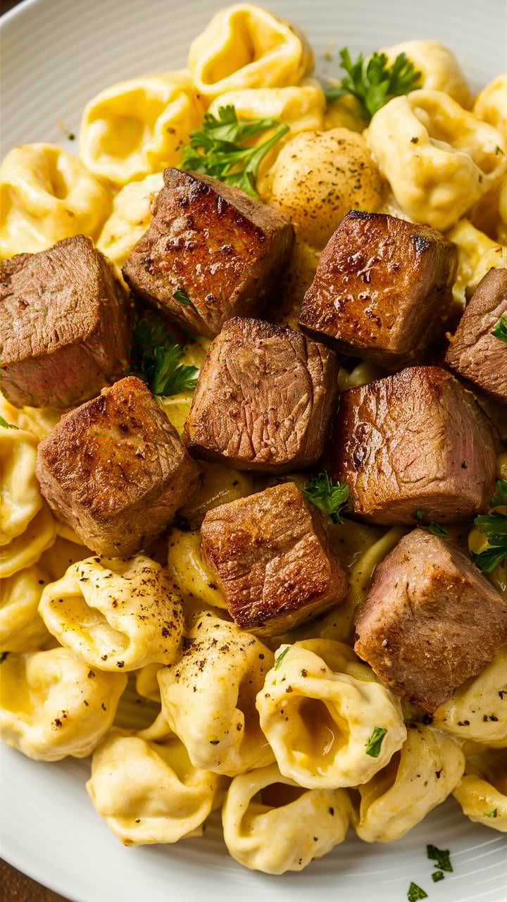 Garlic Butter Steak Bites & Creamy Alfredo Tortellini is the kind of dish that makes any night feel special. It’s indulgent, versatile, and unbelievably easy to prepare. By combining perfectly seared steak with rich, cheesy pasta, you’ll create a meal that satisfies both comfort cravings and gourmet standards.