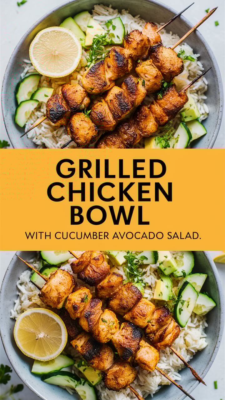 This Grilled Chicken Skewer Bowl with Cucumber Avocado Salad is a high-protein, nutrient-rich meal that’s perfect for lunch or dinner. Juicy grilled chicken skewers are paired with a refreshing cucumber–avocado salad, making it a light yet satisfying recipe that fits into Mediterranean, Keto, and Weight-Loss diets.
